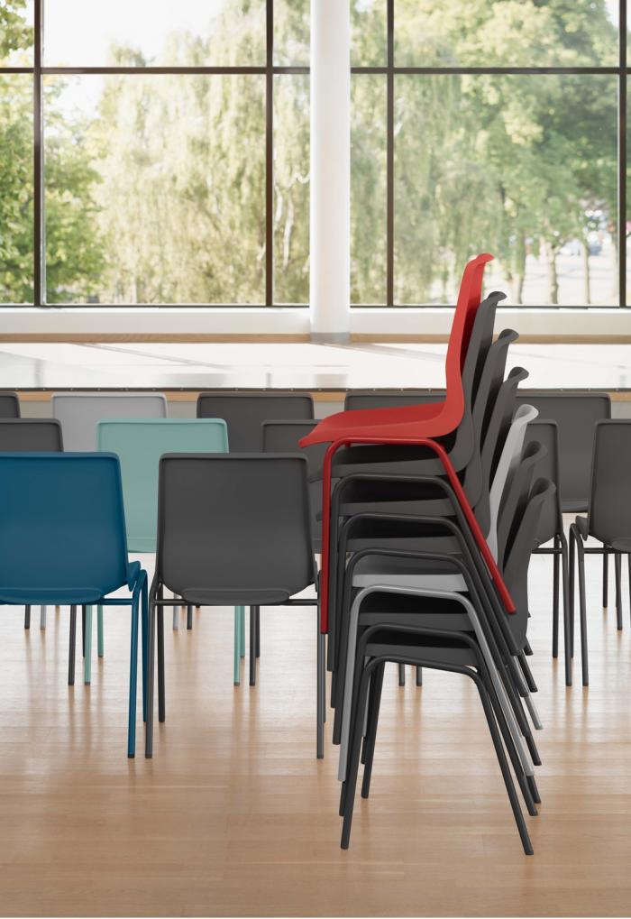 Die Farbvielfalt der Schale (u. a. Vanilla, Misty Grey, Charcoal Grey, Graphite, Sea Green, Teal Blue, Poppy) und des Stahlrohrgestells (u. a. Snow, Metalsilver, Steelgrey, Black RAL9005) ermöglicht stimmige Corporate- und Interior-Konzepte – von dezent bis markant.